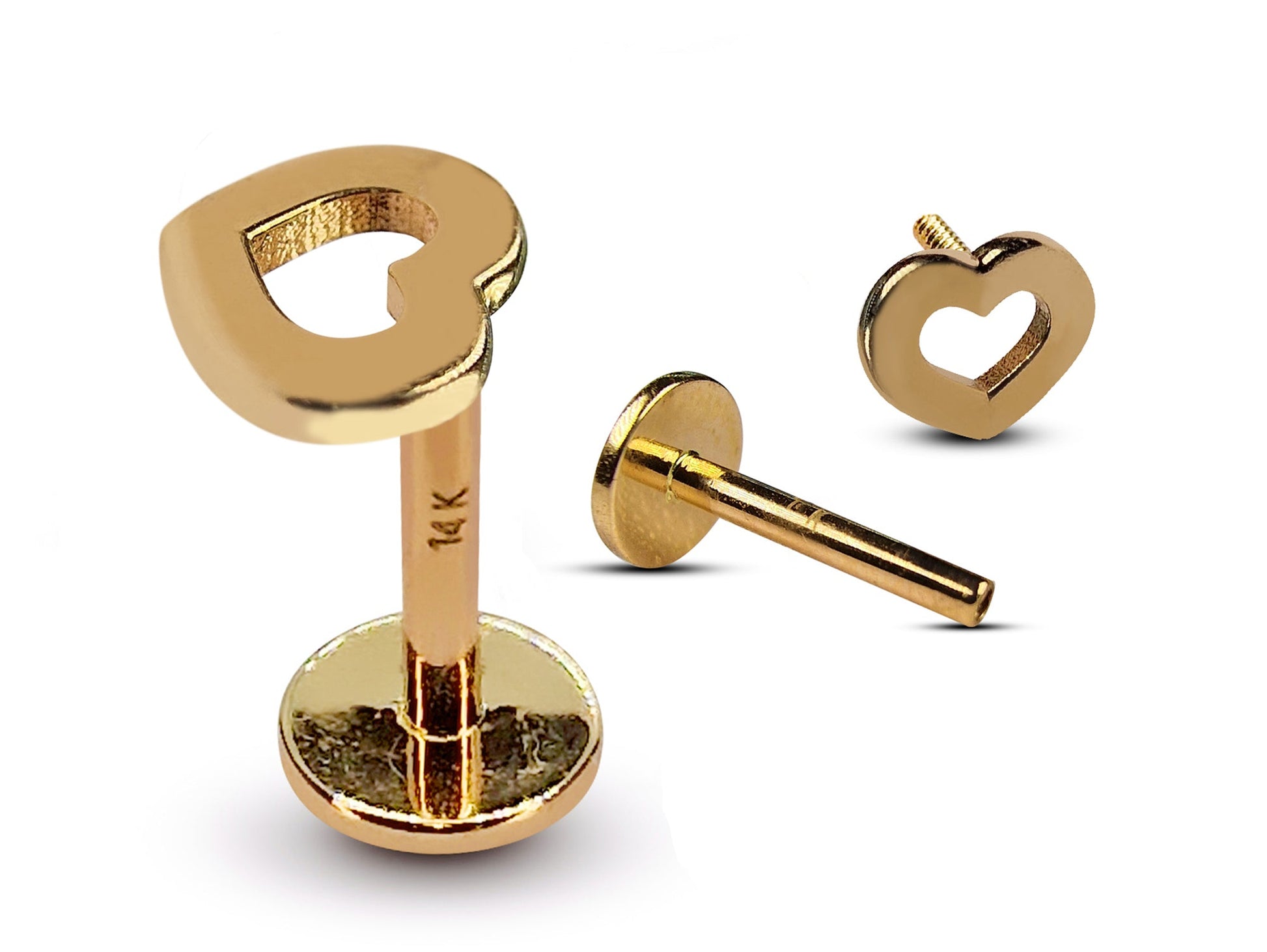 14K Gold Heart Shape Tragus Earring, Cartilage Labret Studs- Internally Threading Body Jewellery Ear Piercing