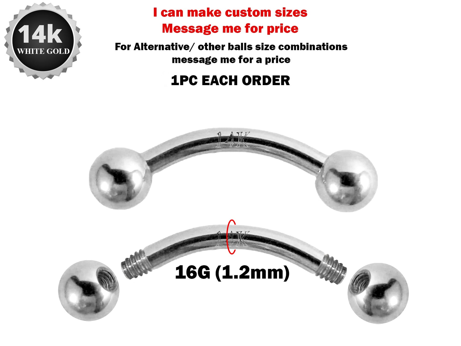 14K White Gold 16G Curved Barbell Piercing - 14K Gold Body Piercing for Eyebrow, Lip piercing, Rook Jewelry, Cartilage Bar