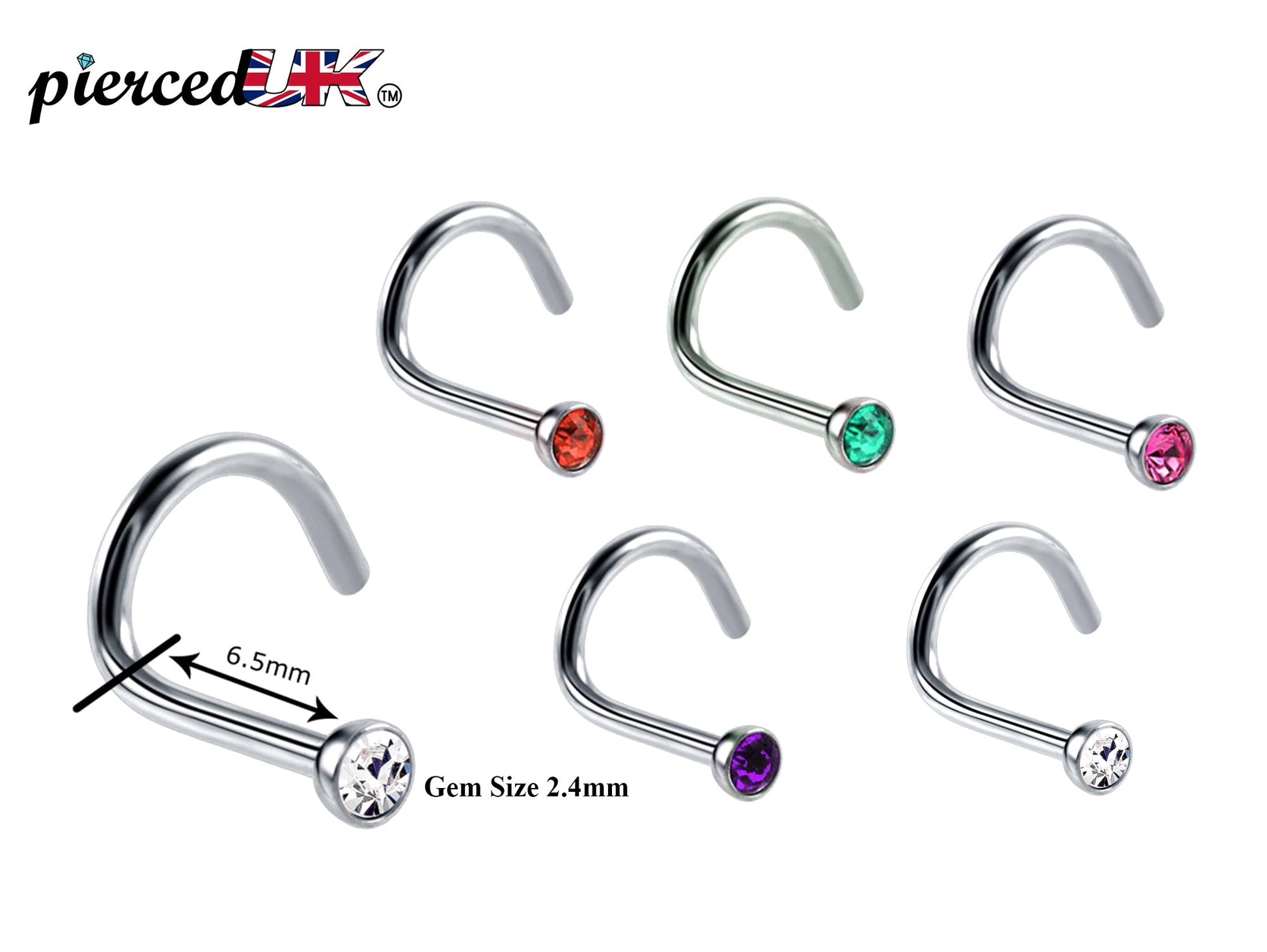 Nostril Screw Ring, Nose Studs - Curved Nose Ring for Nose Piercing - Size 16g (1.2mm) and CZ Gem Size is 2.4mm - Many Colours Available