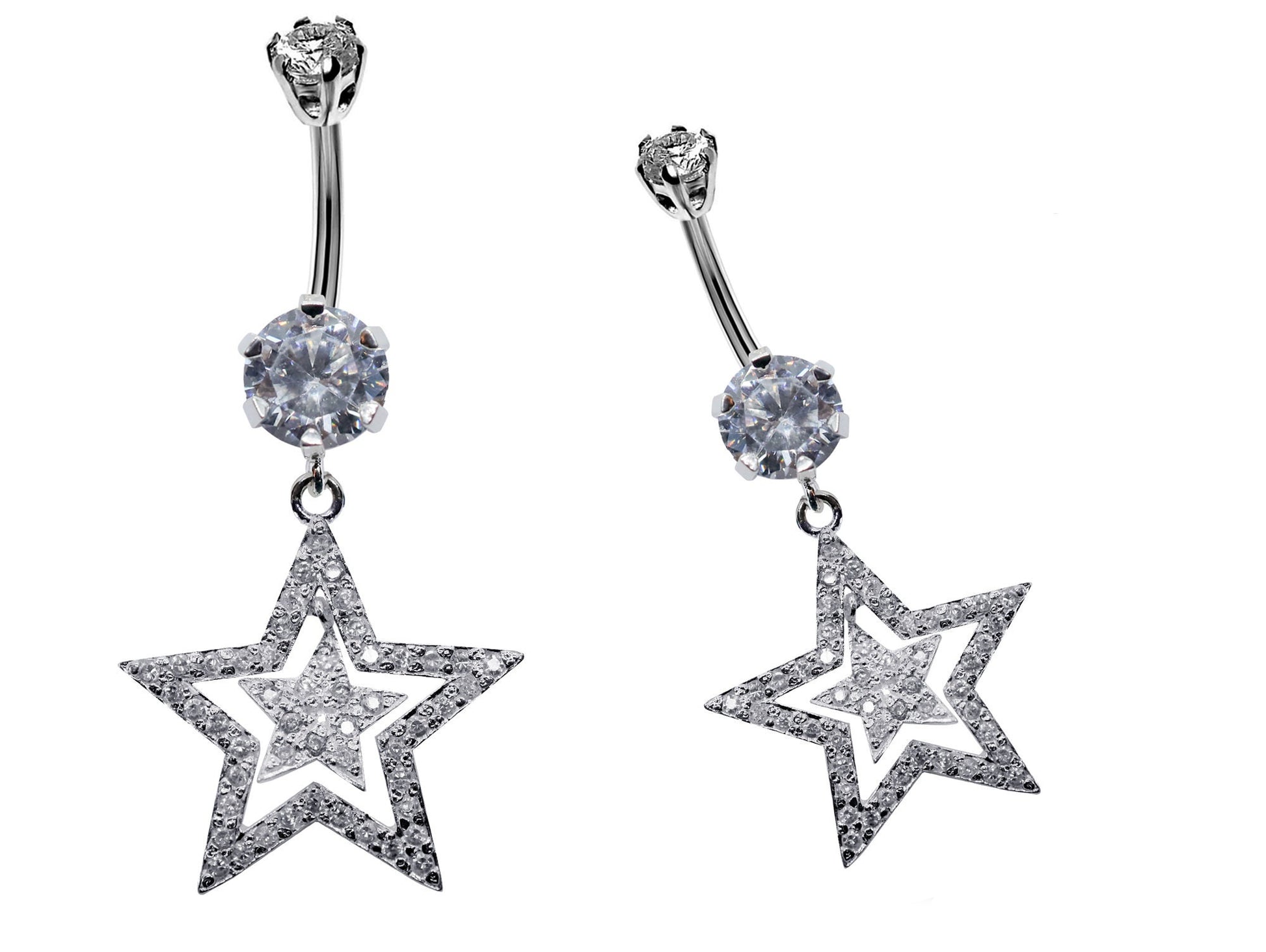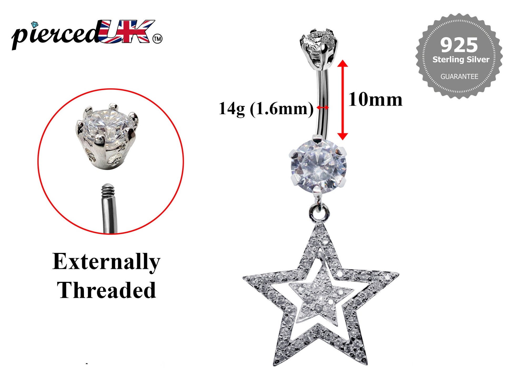Silver Belly Bars, Belly Piercing - Double Star Belly Button Ring with High Quality CZ Crystals - Navel Jewelry - 16g (1.6mm) Length is 10mm