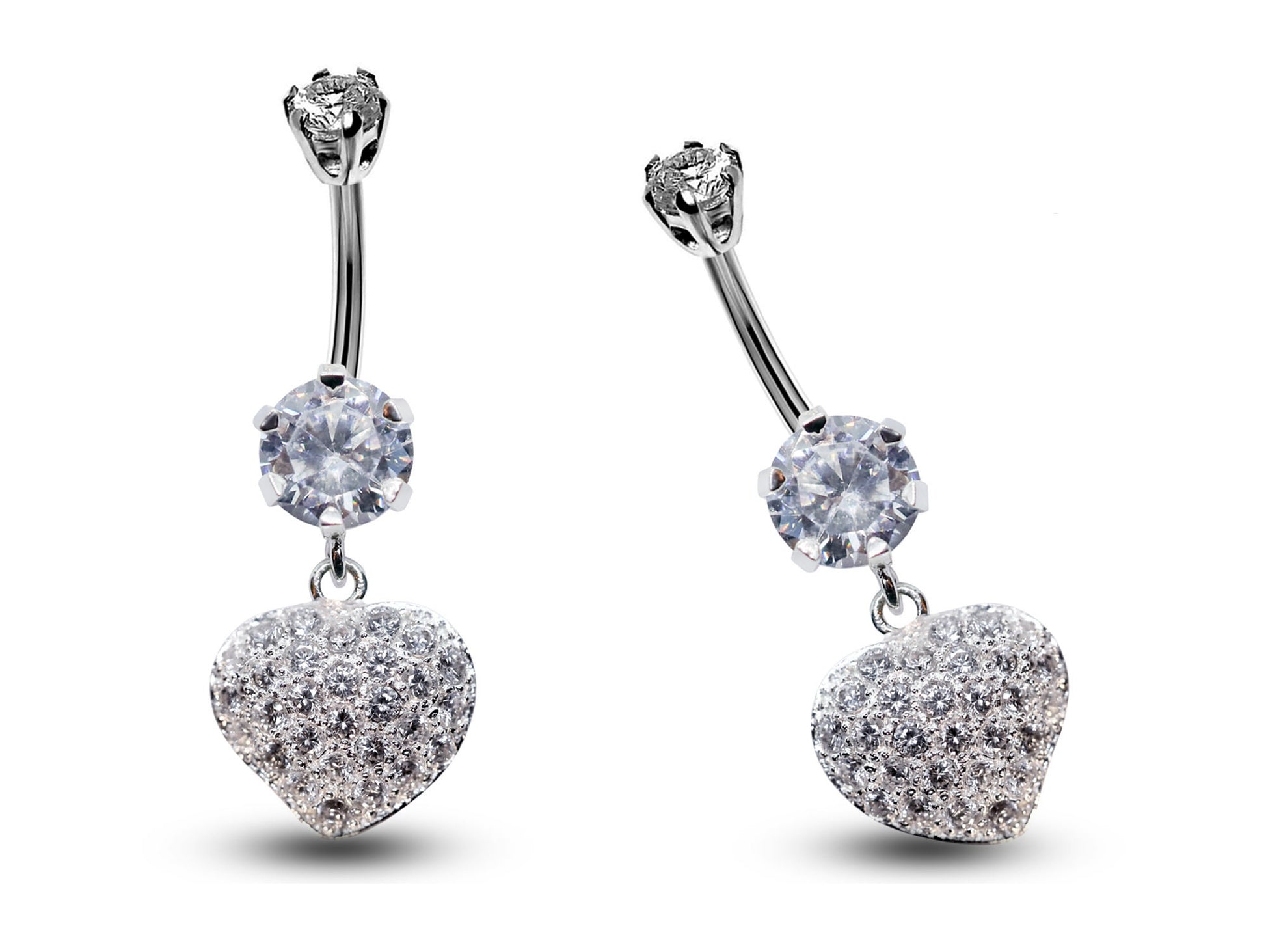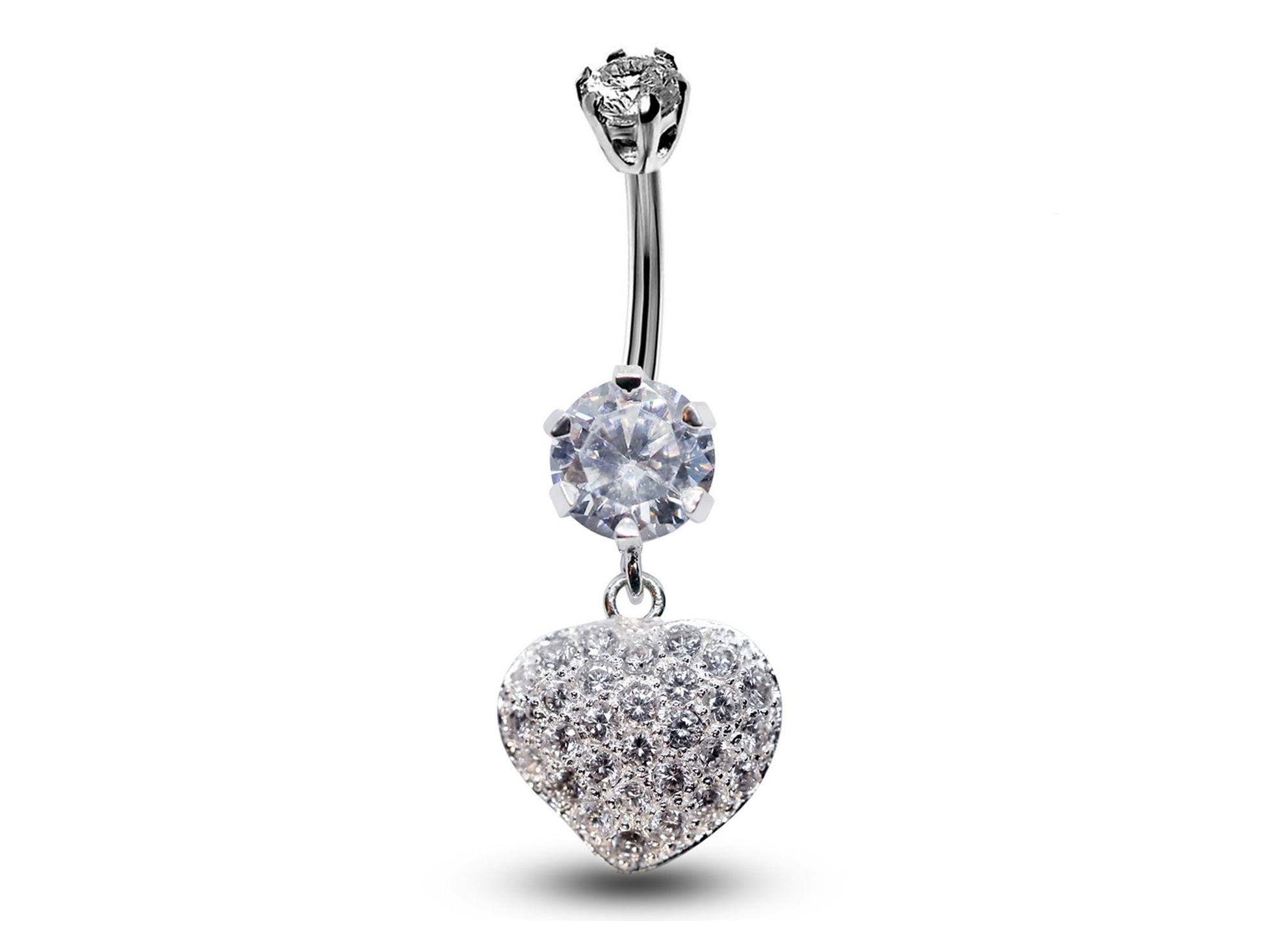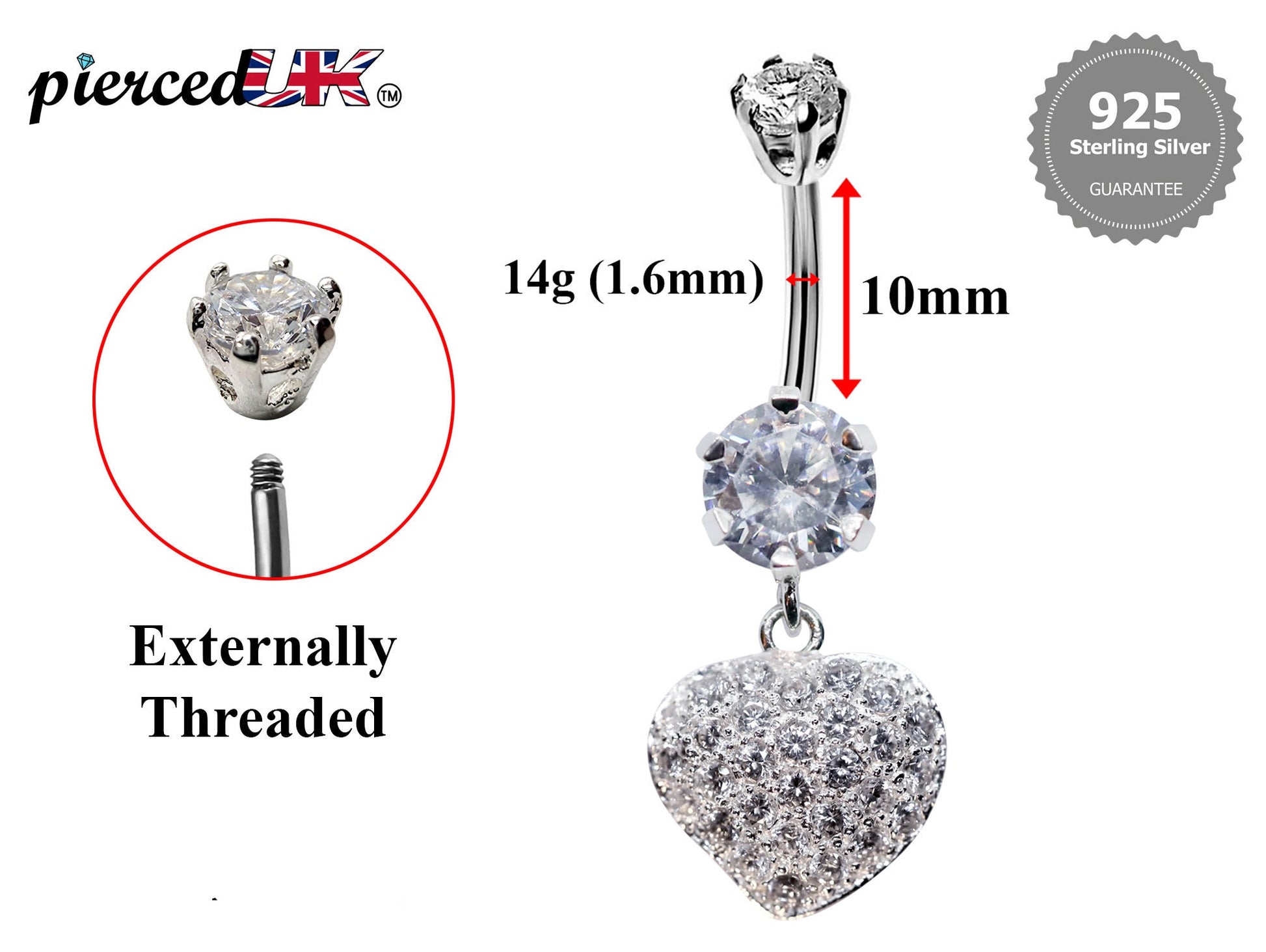 Silver Belly Bars, Navel Ring - Dangle Heart Belly Piercing studded with CZ Crystals - Navel Jewelry - 16g (1.6mm) Length is 10mm