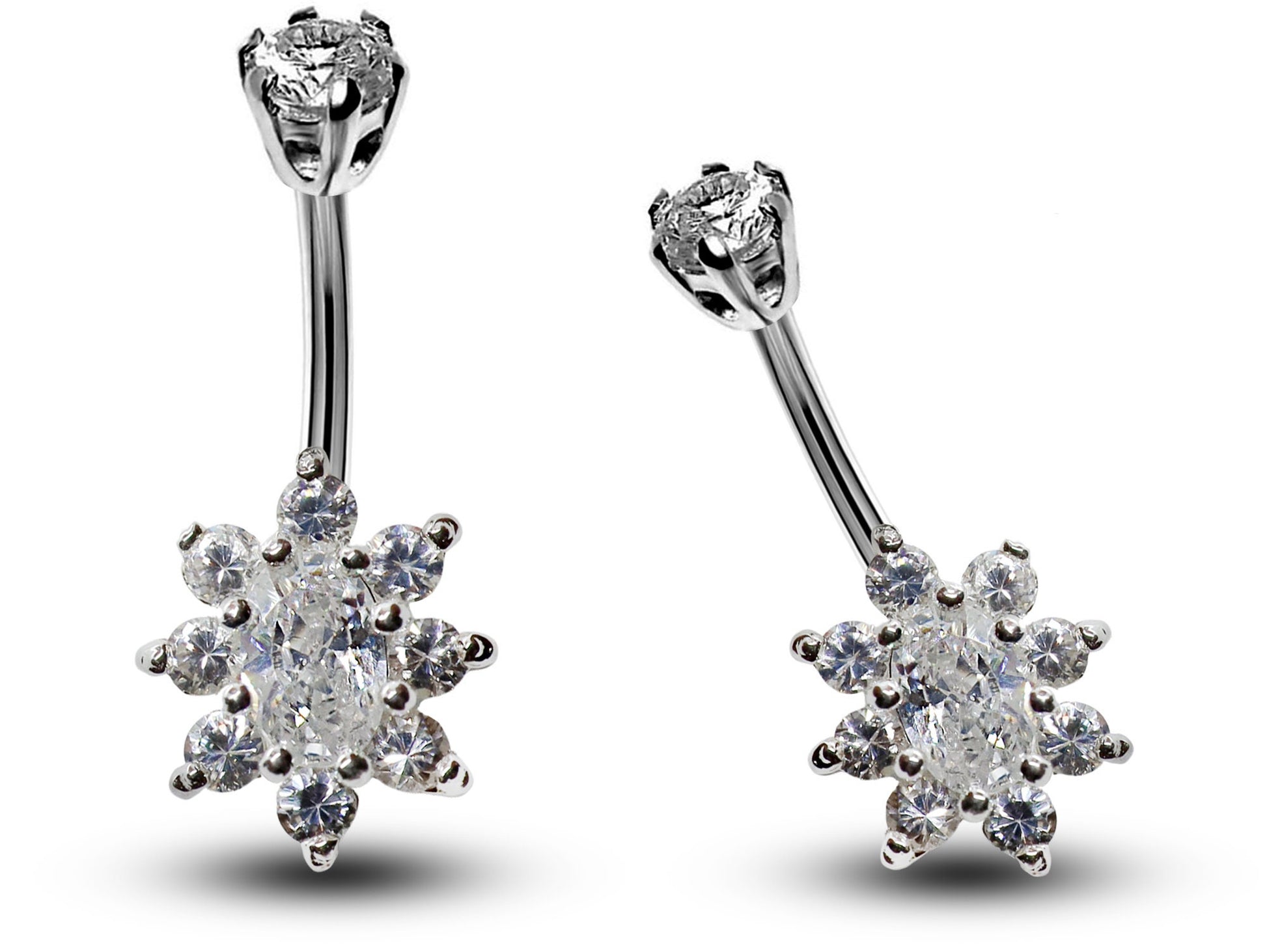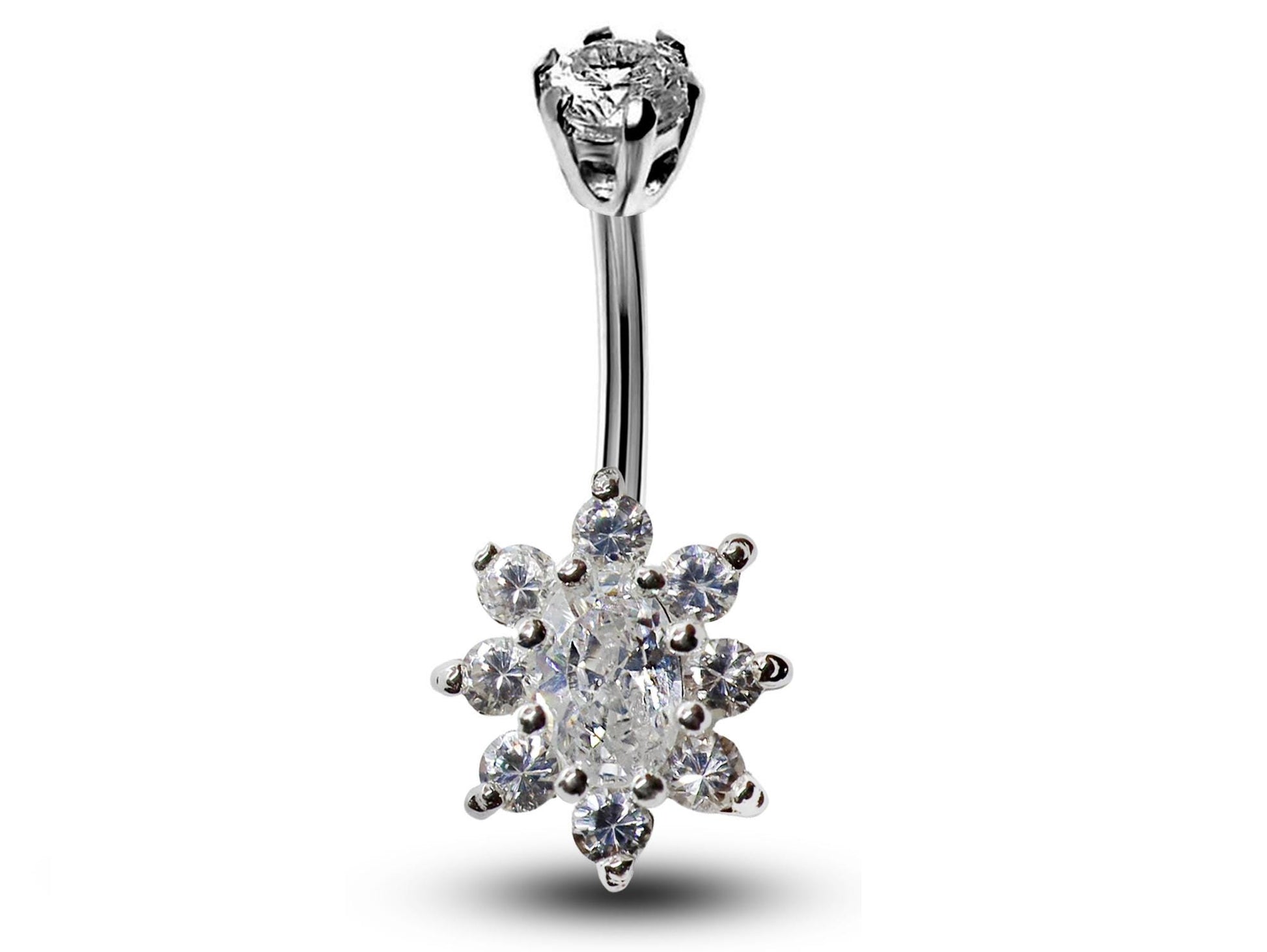 Silver Belly Button Piercing, Belly Bars - Belly Ring Flower CZ Crystals - Navel Ring - 16g (1.6mm) Length is 10mm