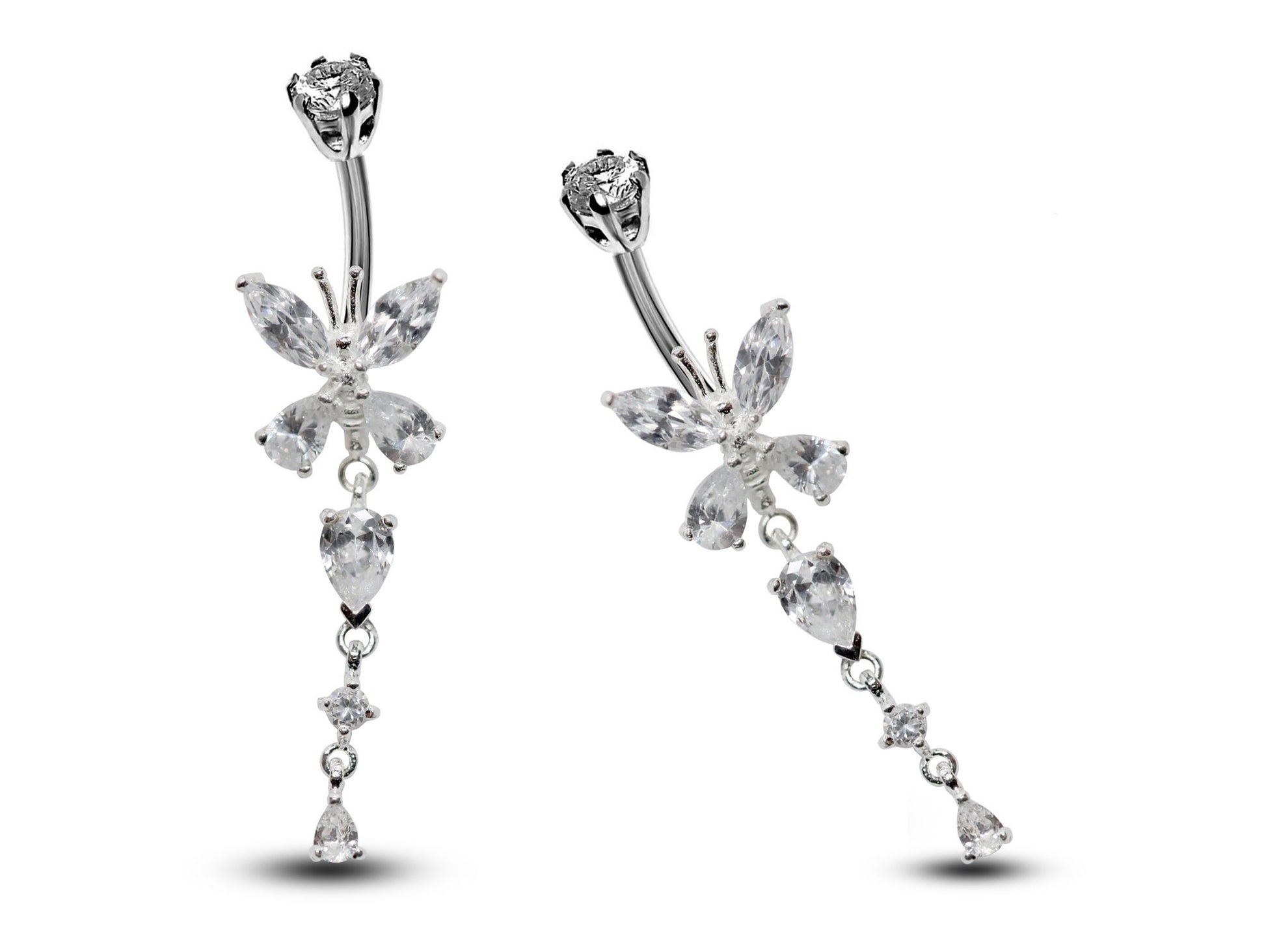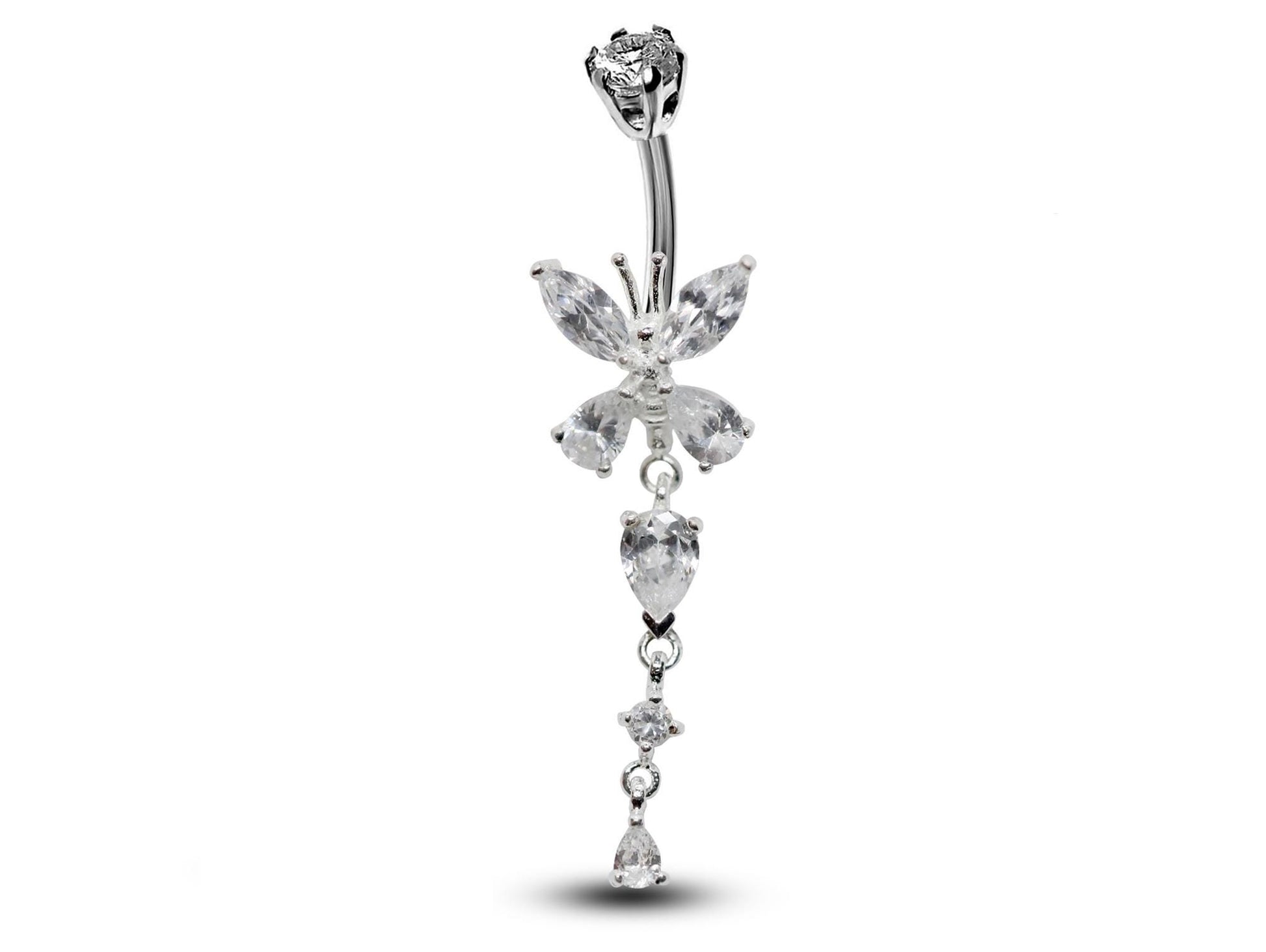 Silver Belly Button Piercing, Belly Bars - Butterfly dangle Belly Ring with Round and Tear drop CZ Crystals Navel Ring 16g (1.6mm)