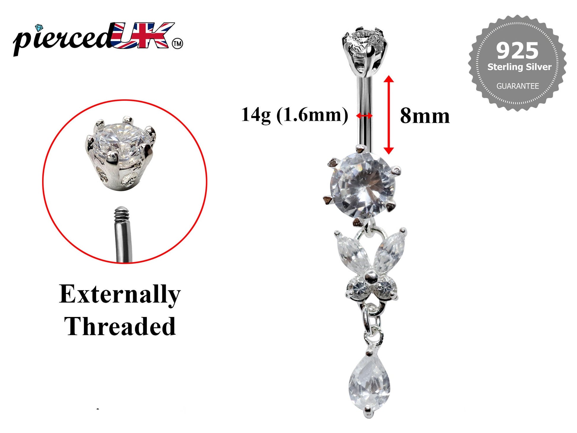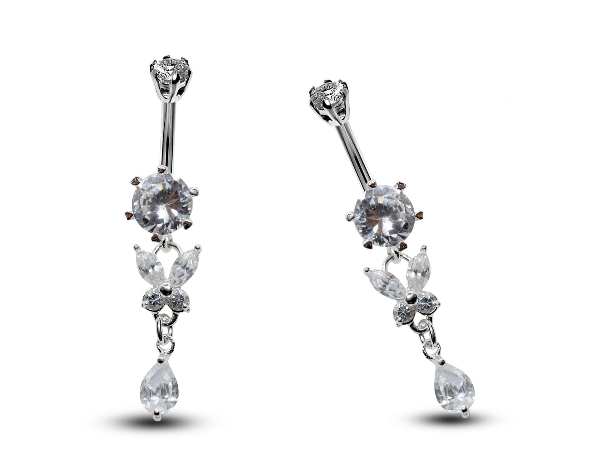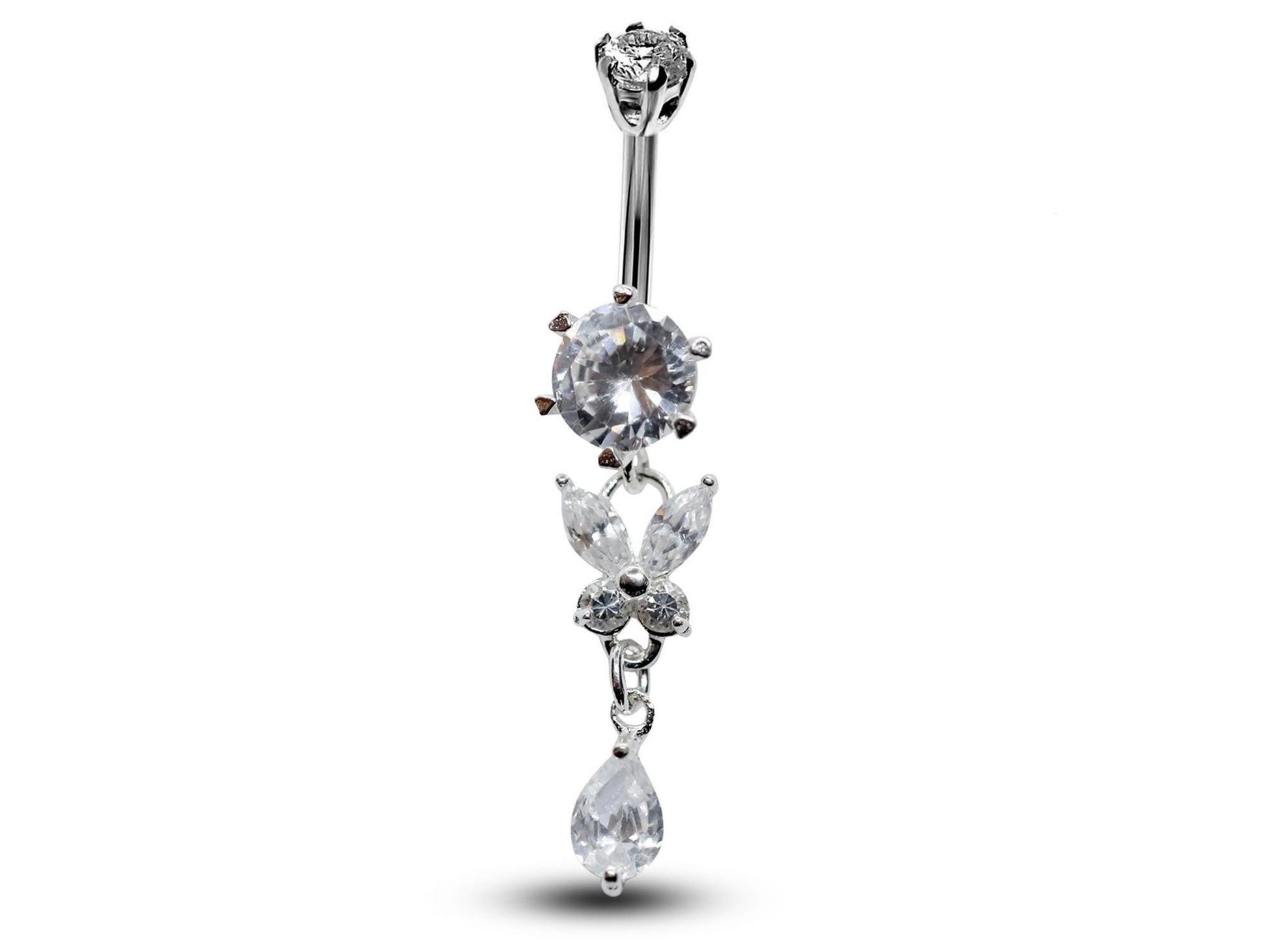 Silver Dangle Belly Bars, Navel Ring - Butterfly Drop Belly Ring with High Quality CZ Crystals - Curved Barbell - 16g (1.6mm) Length is 8mm