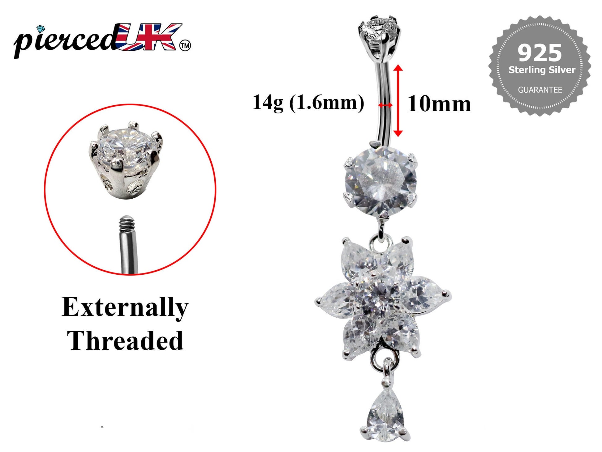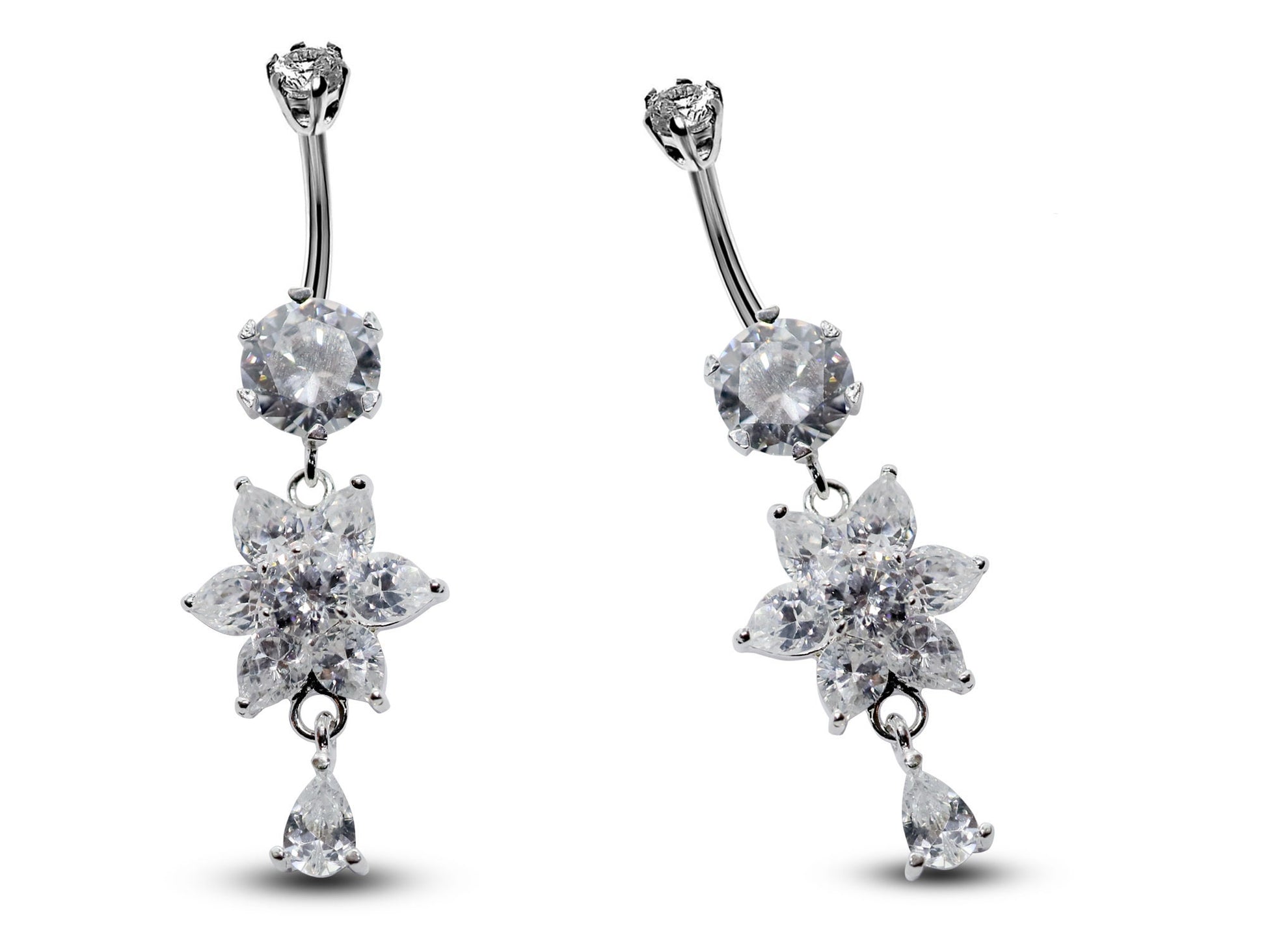 Silver Flower Belly Bars, Navel Ring - Dangle with Tear Drop Belly Piercing with CZ Crystals - Navel Jewelry - 16g (1.6mm) Length is 10mm