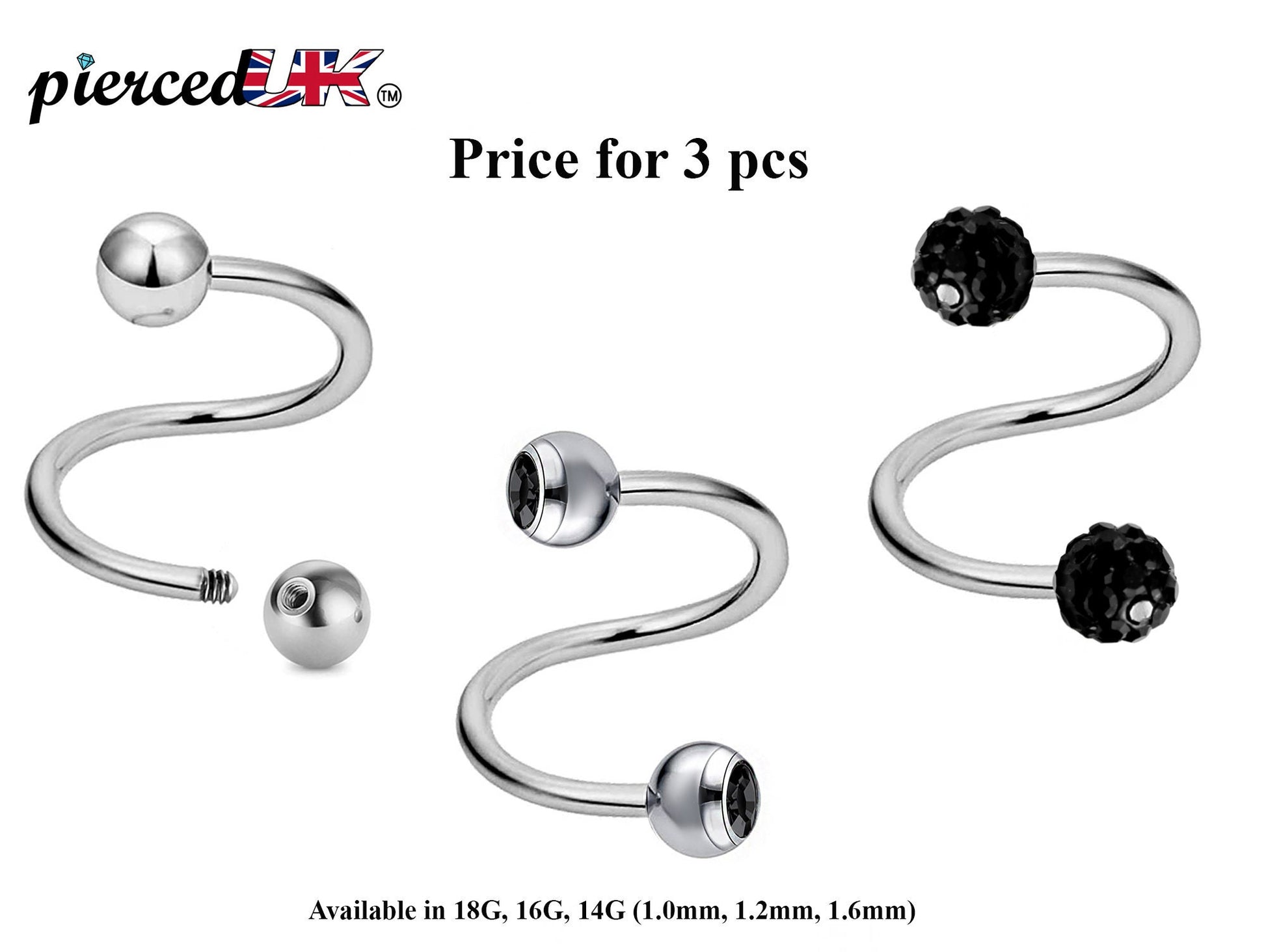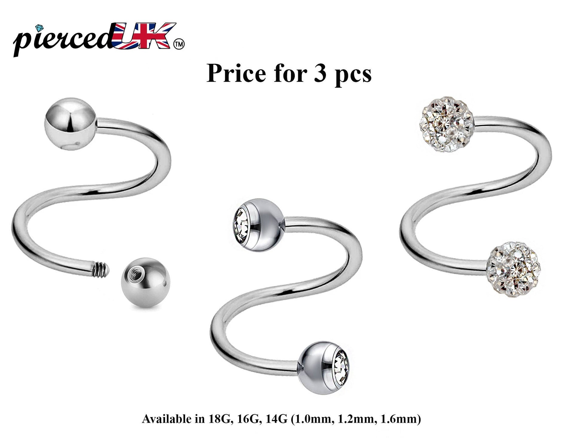 Spiral Barbell, Twist Barbell – 3pcs Piercings with Ball / Gem Ball / Disco Ball for Ear, Eyebrow piercing, Lip Ring, Cartilage, Helix etc.